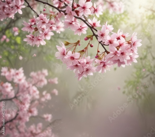 Fototapeta premium Delicate pink sakura petals drift gently on a softly blurred spring background , spring, romantic