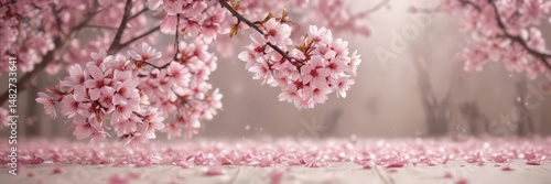 Fototapeta premium Delicate pink sakura petals softly descend against a blurred, dreamy...