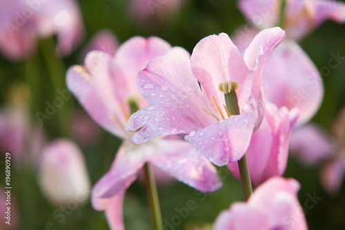 © guppys, Obraz premium delicate pink tulip with drops of dew on petals