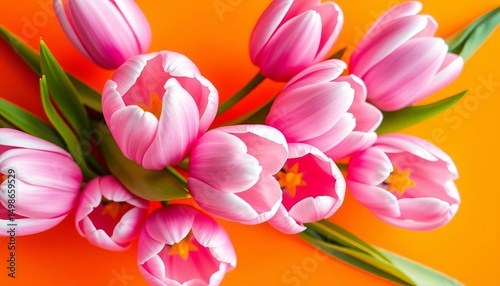 © Boonyapawn, Fototapeta premium Delicate pink tulips clustered on a vibrant orange background, spring card design, colorful, spring flowers