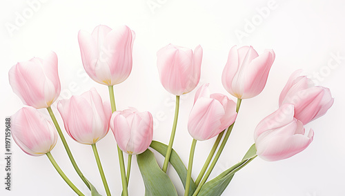 Fototapeta premium Delicate Pink Tulips on White Background: A Spring Floral Arrangement