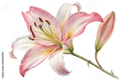 Fototapeta premium Delicate pink white lily flower watercolor painting yellow