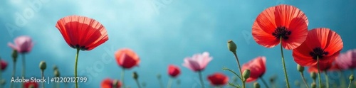 © Anulak, Obraz premium Delicate poppy petals unfolding on a serene blue background, texture, poppies