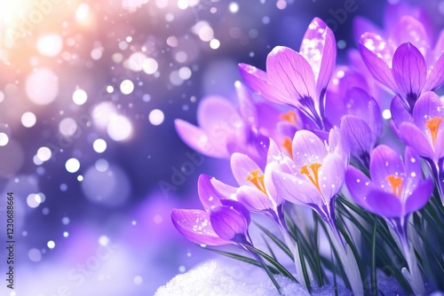 © Natalia, Naklejka premium Delicate purple crocuses bloom through melting snow under soft sunlight with frosty sparkles in a serene and refreshing landscape