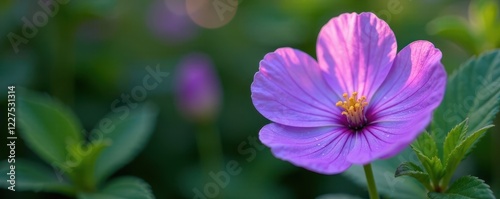 Fototapeta premium Delicate purple flower, smooth petals, serrated leaves, magenta, background