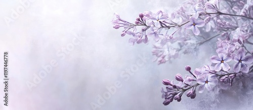 Fototapeta premium Delicate purple lilac blossoms on a soft gray background creating an elegant...