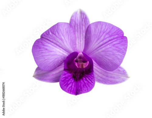 © yustina, Obraz premium Delicate purple orchid bloom with intricate veining on a black background