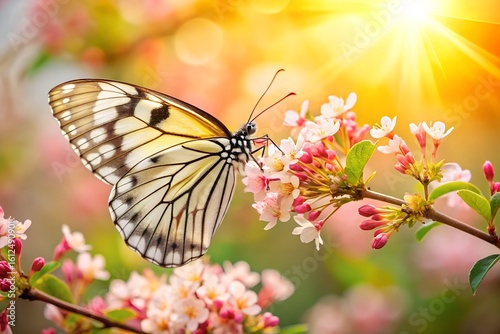 © Abdul, Fototapeta premium Delicate Rice Paper Butterfly on Pink Flowering Branch in Golden Sunlight