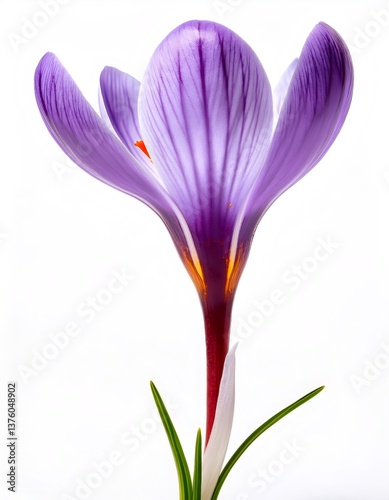 © ArtPixel-Portfolio, Naklejka premium Delicate saffron crocus displaying vivid purple petals, bright orange stigma emerging from verdant green foliage, set against pristine white backdrop