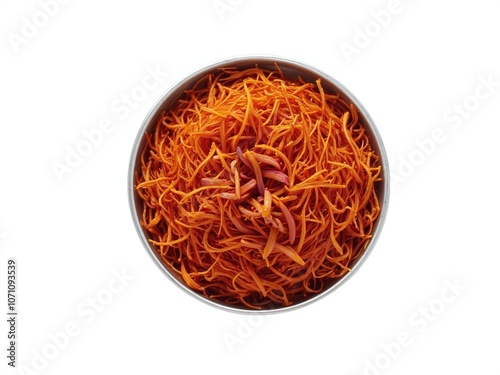 © Content & Code, Fototapeta premium Delicate Saffron Threads Inside Round Metal Container Isolated on White Background