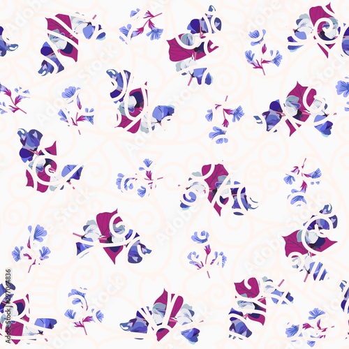 © Happy Dragon, Fototapeta premium Delicate seamless ornament with lace pattern against gentle blue flowers on light background. Print for fabric, wallpaper.