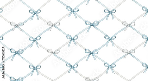 © saqlain, Naklejka premium Delicate seamless pattern of light blue and silver bows on a white background creating a diamond lattice effect