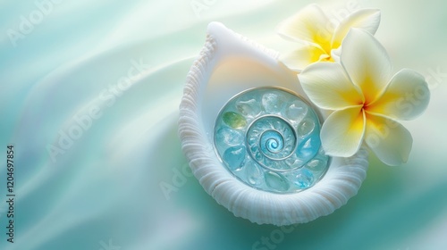 Fototapeta premium Delicate seashell, flowers, crystals, serene turquoise background