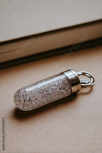 Naklejka premium Delicate silver capsule filled with shimmering particles rests gently on a...