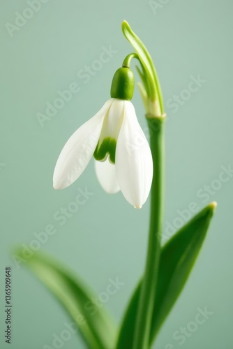 Fototapeta premium Delicate single snowdrop, pure white petals, green stem , snowdrop, floral
