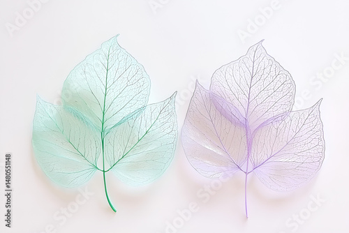 © iCreative, Fototapeta premium Delicate skeleton leaves in shades of green and purple showcasing intricate venation patterns on a neutral background.