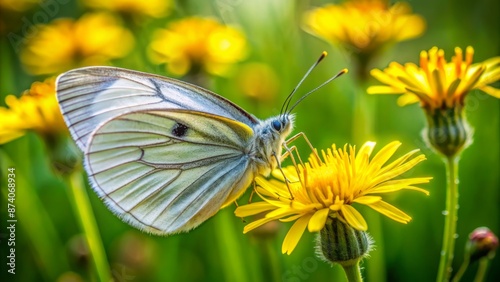 Naklejka premium Delicate small white butterfly with intricate wing patterns perches on a vibrant yellow flower in a lush green field landscape.