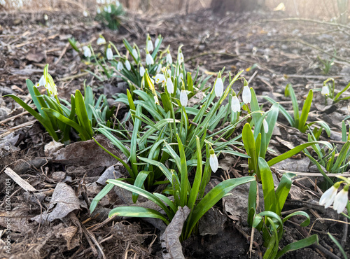 Fototapeta premium Delicate snowdrops blooming through dry forest ground in early spring