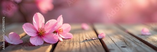 © Withun, Fototapeta premium Delicate soft pink blossoms float on a wooden table's surface, quiet, serene, pink