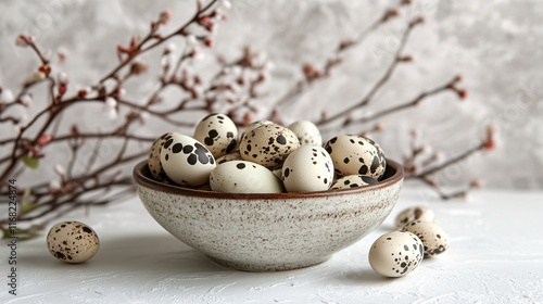 © Duskcraft, Fototapeta premium Delicate Speckled Eggs Arranged in a Rustic Bowl Surrounded by Elegant Branches