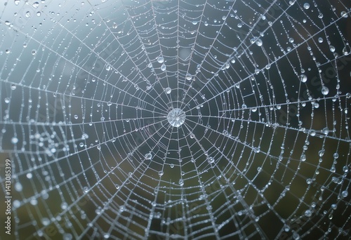 Fototapeta premium Delicate spider web adorned with dew drops in early morning light