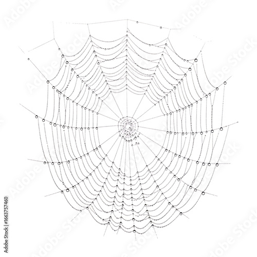 © aldynata, Obraz premium Delicate Spiderweb Adorned with Morning Dew Drops on a White Background