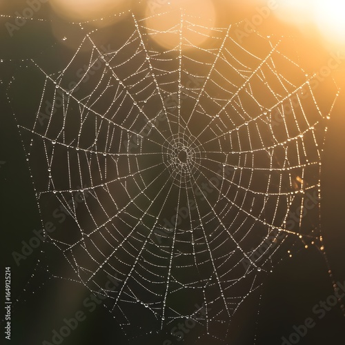 Obraz premium Delicate spiderweb bejeweled with dew, glowing in soft early morning light,...