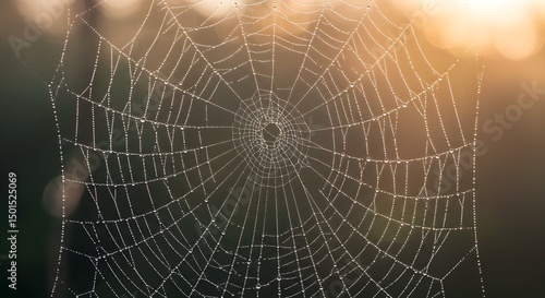 © OTONG, Fototapeta premium Delicate spiderweb covered with morning dew in soft sunlight