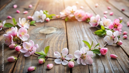 © InspireStock Gallery, Fototapeta premium Delicate Spring Blossoms Arranged in a Heart Shape on Rustic Wooden Surface