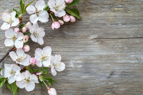 Fototapeta premium Delicate spring blossoms arranged on weathered wood, creating a serene and...