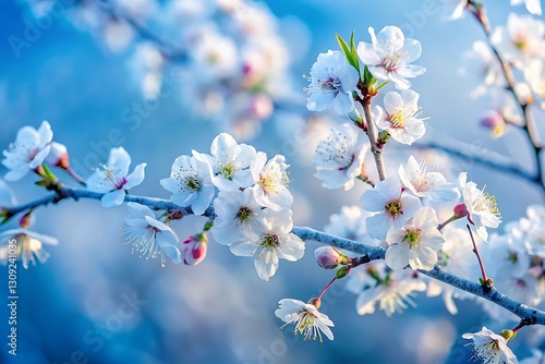 © Apon, Obraz premium Delicate Spring Blossoms in Soft Blue Light
