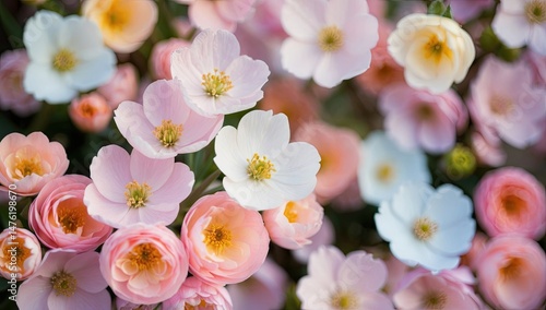 © Nikolai, Fototapeta premium Delicate Spring Flowers in Shades of Pink, White, and Blue Against a Blurred Background