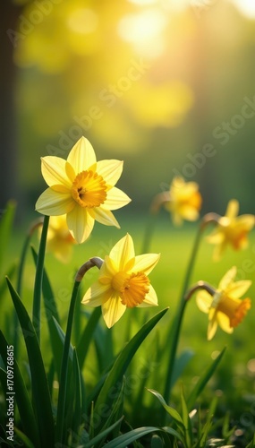 Fototapeta premium delicate springtime scene with daffodils swaying gently in soft warm light,...