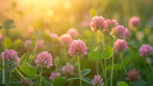 © AlfaSmart, Fototapeta premium Delicate strawberry clover flowers illuminated by the warm light of a sunset