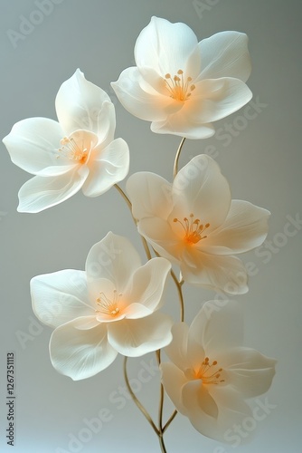 © Ilja, Obraz premium Delicate, Translucent White Sculpted Blossoms with Subtle Yellow Centers on Thin Gold Stem