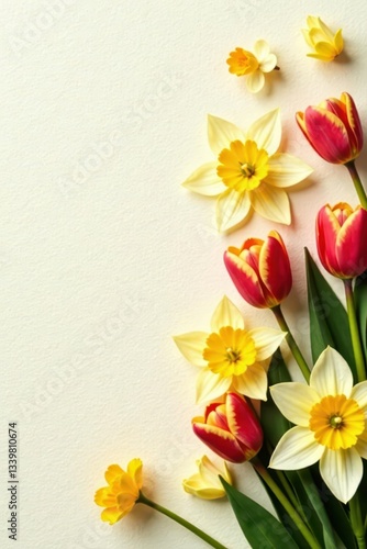 Fototapeta premium Delicate tulips & daffodils on textured cream paper, spring, springtime, white