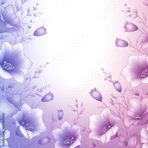 © Victoriya, Fototapeta premium Delicate violet pink floral background. empty space in the middle. Mesh gradient lilacs bells for graphic design. Vector abstract background with aura, soft overlay