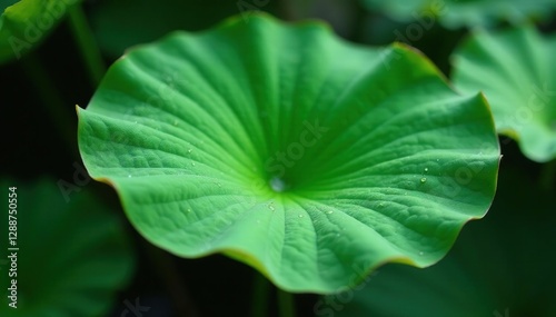 Fototapeta premium Delicate water lily leaf with intricate veins and dew drops, pond life, green leaves, lotus