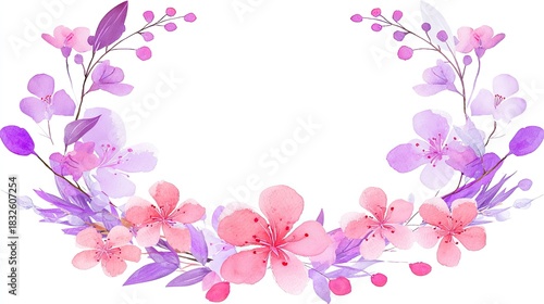 Naklejka premium Delicate watercolor arrangement of pink and purple blossoms forms a beautiful...