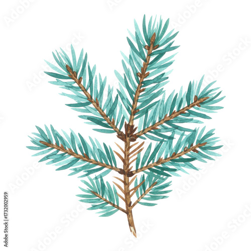 © Mangku, Naklejka premium Delicate watercolor branch of teal evergreen isolated on white background