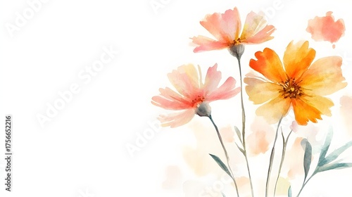 Naklejka premium Delicate watercolor flowers in soft hues bloom against a clean white background.