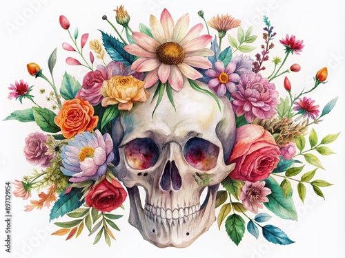 Fototapeta premium Delicate watercolor illustration of a skull adorned with vibrant flowers,...