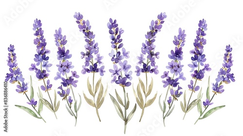 Naklejka premium Delicate watercolor illustration of blooming lavender flowers, perfect for natural and botanical design projects.