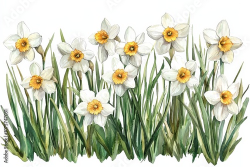 © Uliana, Fototapeta premium Delicate watercolor illustration of narcissus flowers with white and yellow petals surrounded by green grass, perfect for spring-themed designs on a transparent background..