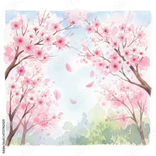 © novi syahdah, Fototapeta premium Delicate watercolor painting depicting blooming cherry blossoms in springtime serenity