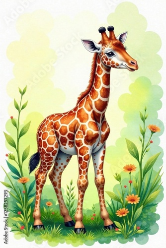 Fototapeta premium Delicate watercolor painting of a giraffe calf surrounded by lush greenery, baby animal, safari