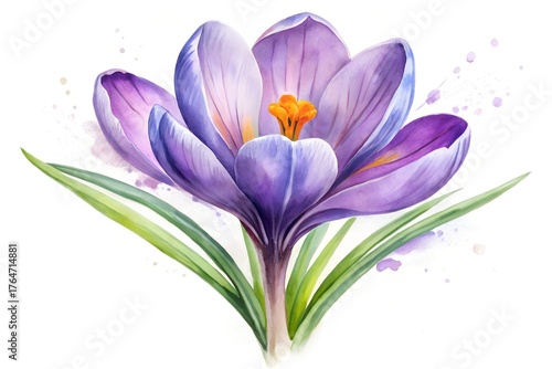 Fototapeta premium Delicate watercolor painting of a vibrant purple crocus flower with green leaves and artistic splatters