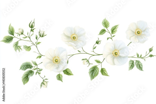 Fototapeta premium Delicate watercolor painting of white blossoms and green leaves arranged in a...