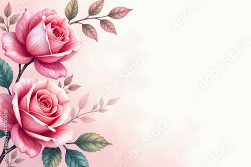 Fototapeta premium Delicate watercolor roses & leaves, blush pink hues, textile, pink