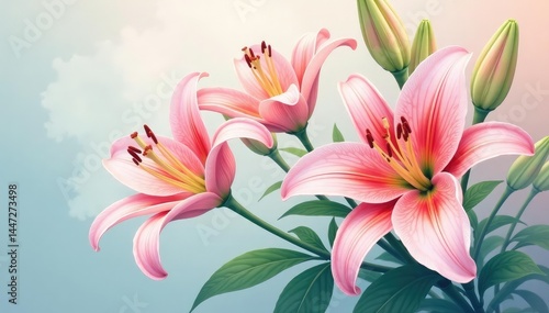Fototapeta premium Delicate watercolor-style lilies, soft pastel shades, overlapping blooms ,...